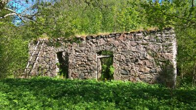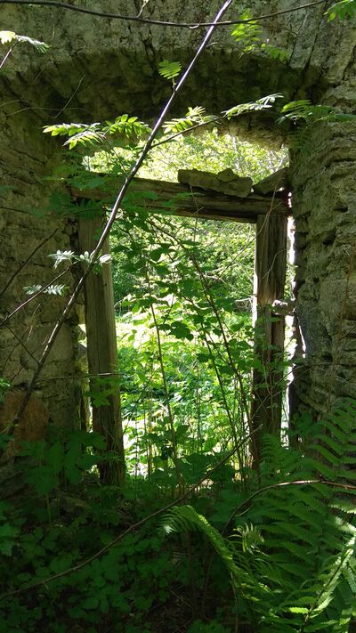 Veskihoone üldine tänapäevane seisund (2020 kevad): varemed, püsti ainult kolm pragudega seina.