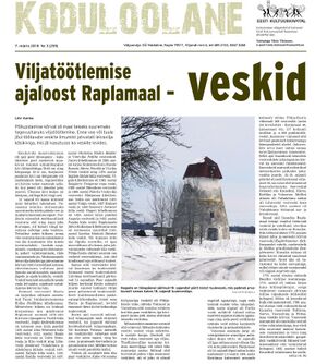 RAPLAMAA SÕNUMID, 7. märts 2018 Nr 3 (259) Väljaandja: OÜ Nädaline  ; Rapla 79511, Viljandi mnt 6, tel 489 2133, 5567 3260, Toimetaja Tõnis Tõnisson, e-post: tonis.tonisson@sonumid.ee; KODULOOLANE, Viljatöötlemise ajaloost Raplamaal – veskid; Liivi Aarma.
