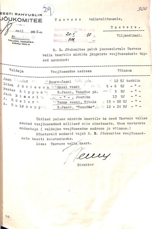 Taevere valla veskite ankeet Jõukomitee veskite loendusel 1938-1940